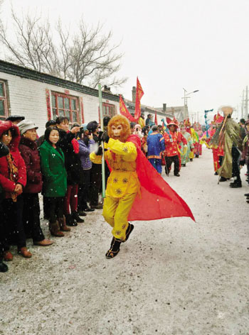2月12日,農歷正月初五,五寨縣前所鄉南坪村正在進行的八大角秧歌表演,村民們冒著風雪駐足觀看。圖為一村民扮演的美猴王。(許凈 攝)