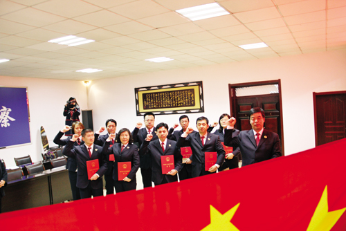 2 月25 日,岢嵐縣檢察院舉辦首批入額檢察官宣誓儀式。該院是忻州市檢察系統2015 年司法體制改革首批試點單位。一年以來,經過層層選拔,首批10 名檢察官脫穎而出,市檢察院和岢嵐縣人大、政協領導到場祝賀,希望入額檢察官擔當重任,充分發揮職能作用,維護好社會公平正義。(程玉光 攝)