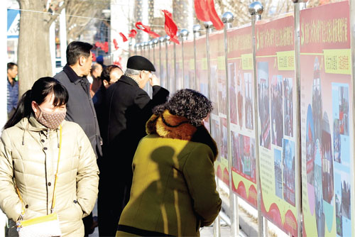 2月21日,忻府區區委、區政府門前“踐行社會主義核心價值觀”圖片展,吸引了眾多市民觀看學習。 (張志遠 攝)