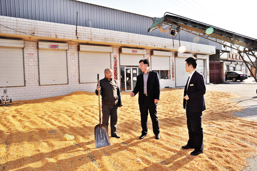代縣陽明堡鎮崔莊村農民侯德英,去年冬天從泓都村鎮銀行貸款60萬元,幫助農民群眾銷售玉米500萬公斤,創收70萬元。圖為侯德英晾曬即將出售的玉米。(石俊文 周世明 攝)