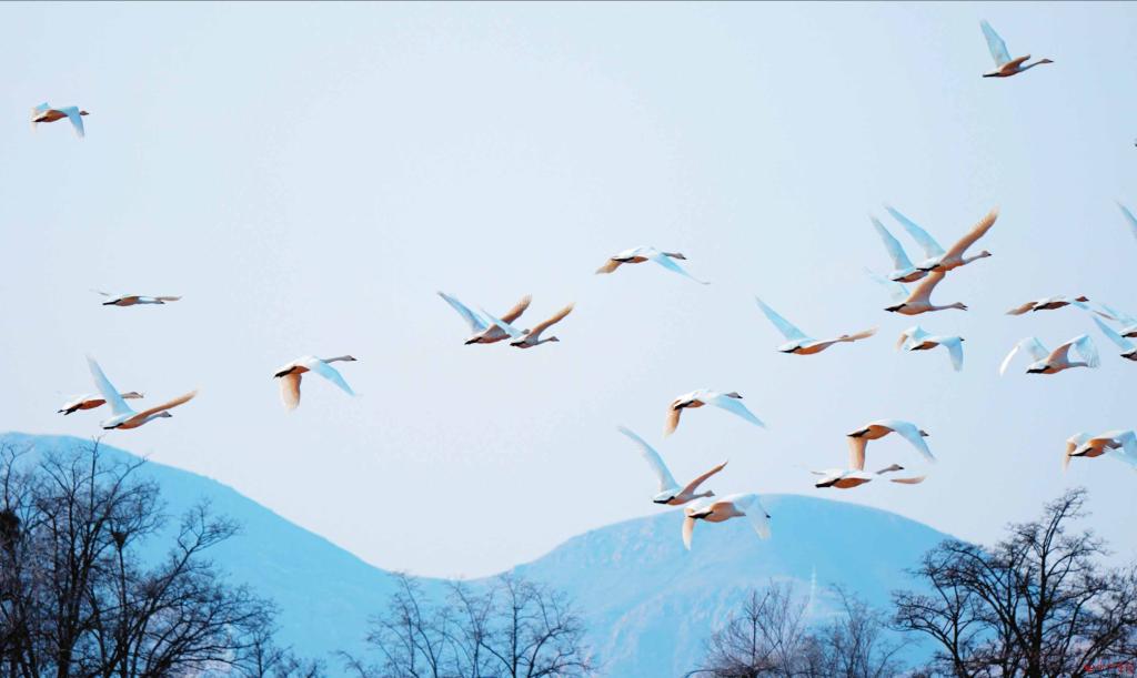 在忻府區(qū)永豐莊,成群結(jié)隊的天鵝舒展著潔白的羽翼在天空翱翔,或引吭高歌,或盤旋飛舞,與周圍的田野、藍(lán)天構(gòu)成了一幅和諧而靈動的唯美畫卷。 (張 鵬攝)