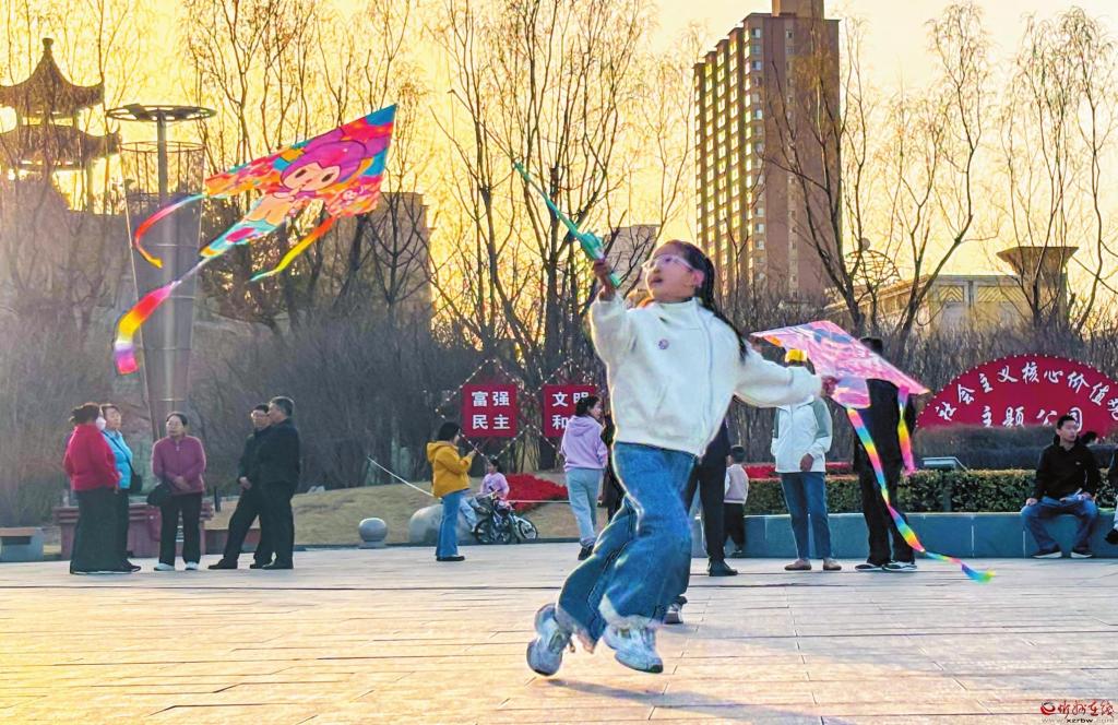 春分時節,在忻州城區人民公園,家長與孩子共同放飛風箏,各色風箏在天空中爭奇斗艷,洋溢著春日的歡樂氣息。 (