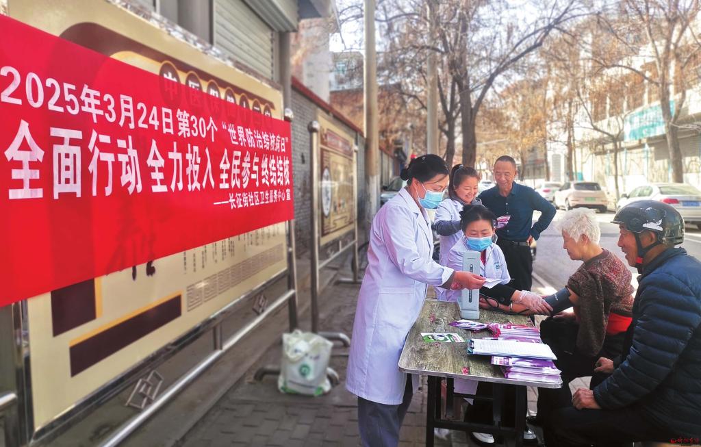 3月24日,是第30個世界防治結核病日。為進一步動員社會各界廣泛參與,增強公眾健康意識,推動全市結核病防治工作,市衛健委組織開展了世界防治結核病日系列宣傳活動。圖為忻府區長征街社區衛生服務中心醫護人員為群眾測量血壓。 (記者 宮清華攝)