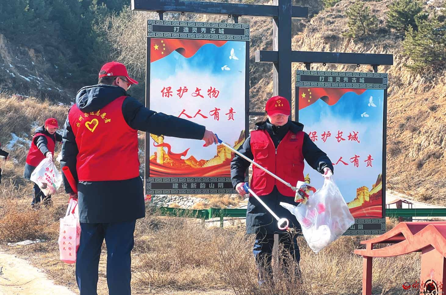 近日,山西交控忻州公司新廣武收費站的志愿者身著醒目的紅馬甲,來到廣武明長城開展志愿服務活動。圖為志愿者手持夾子等工具,認真撿拾垃圾。 (