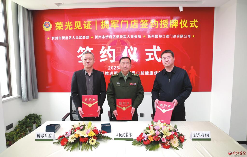 4月8日,忻府區人民武裝部、忻府區退役軍人事務局與國邦口腔共同簽署《社會化擁軍戰略合作協議》,共筑軍民融合新篇章。(記者 張存良攝)