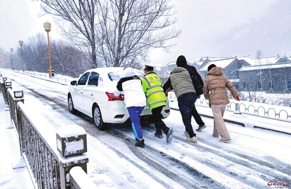 圖為交警與游客合力將受困車輛推移至安全區域。