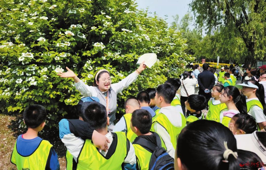 初夏時節,忻府區花開正艷、氣候宜人,孩子們走出校園,開啟了一場別開生面的研學之旅,在大自然中增長知識、收獲成長。活動中,孩子們在老師的帶領下,了解本地植物種類和生態鏈相關知識,認真填寫研學手冊。圖為5月10日,參加研學活動的學生在人民公園聽老師講解植物特性。 (記者 張存良攝)
