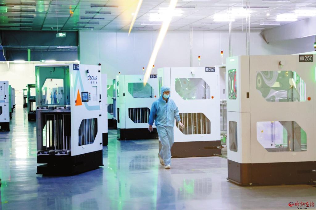 坐落于忻州經濟開發區的一道新能源科技(忻州)有限公司是一家主要從事高效光伏電池及組件的研發、制造與銷售,同步覆蓋太陽能發電技術服務、電池制造及太陽能熱利用產品的企業。該公司構建起的“黑燈工廠”級智能化生產線展現出強大的生產能力和高效的運營水平,自主研發的TOPCon4.0光伏電池量產效率已達26.7%,處于行業領先。圖為一道新能源智能化生產車間。 (記者 張存良攝)