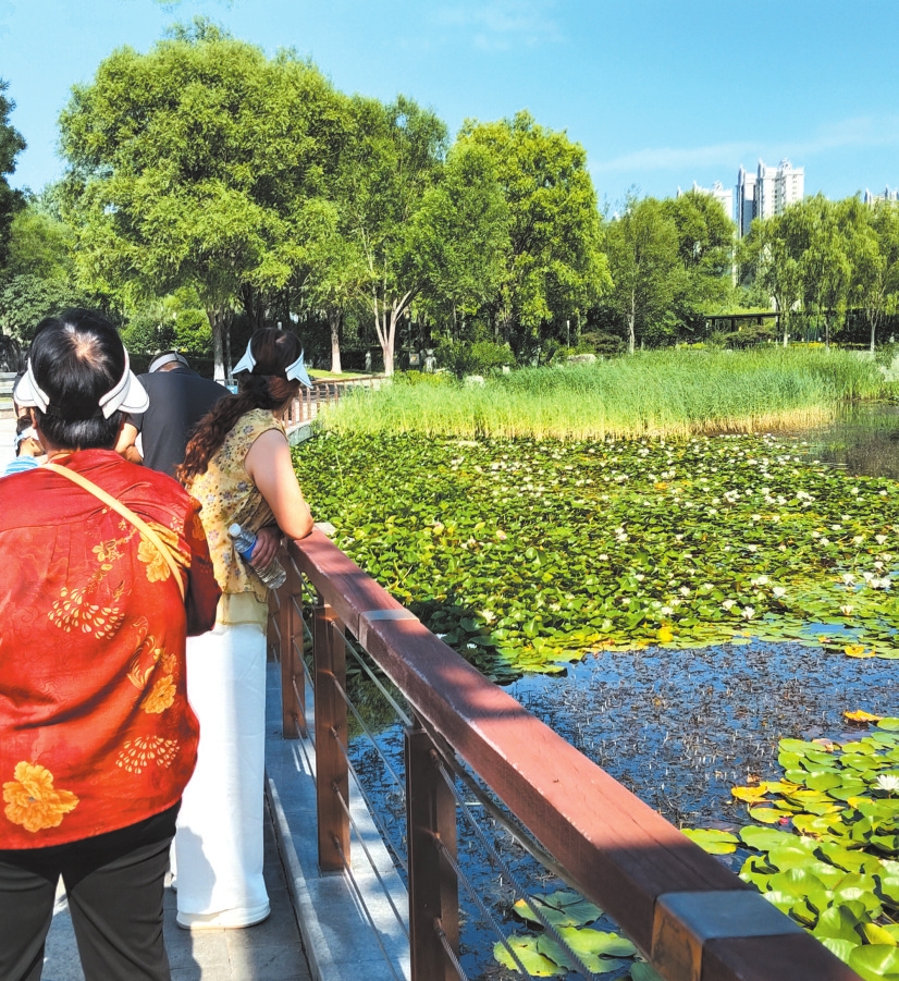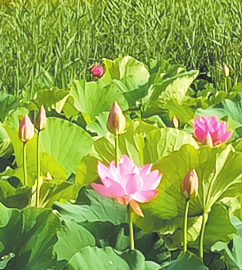 暮色漫上來時,荷塘最是熱鬧。穿花裙的小娃娃踮腳摸蓮蓬,銀發的老夫妻坐在石凳上數花瓣,晚歸的人駐了步,手機鏡頭里全是荷的身影。風推著荷浪輕搖,像在說:“別急,等你。”