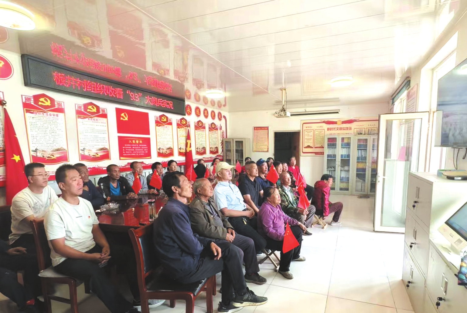 神池縣板井村村民在村委會觀看紀念大會。續琴攝