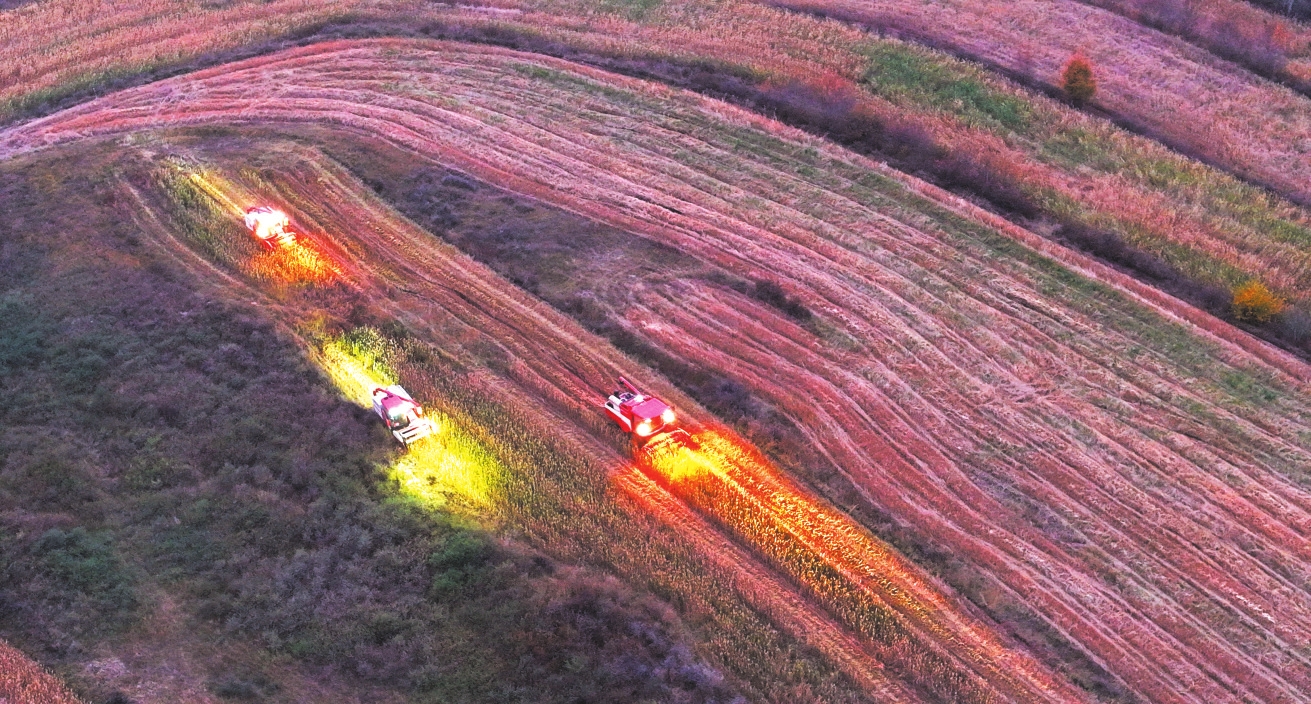 河曲縣劉家塔鎮千畝谷子基地搭載北斗導航系統收割機正在作業。何帥攝