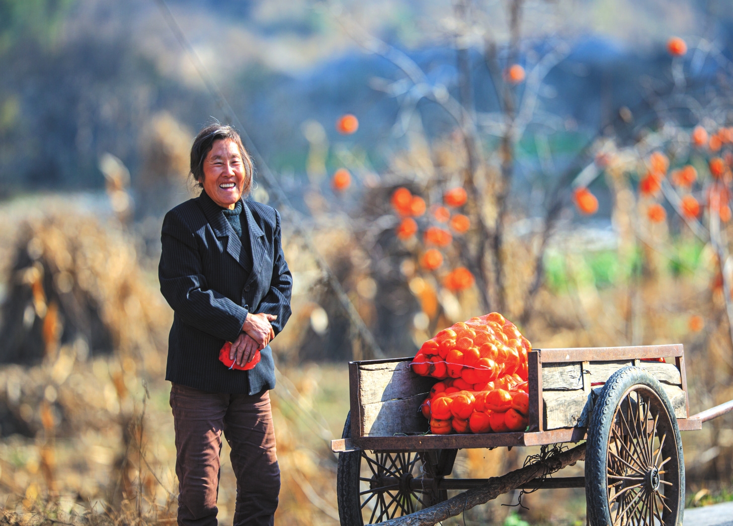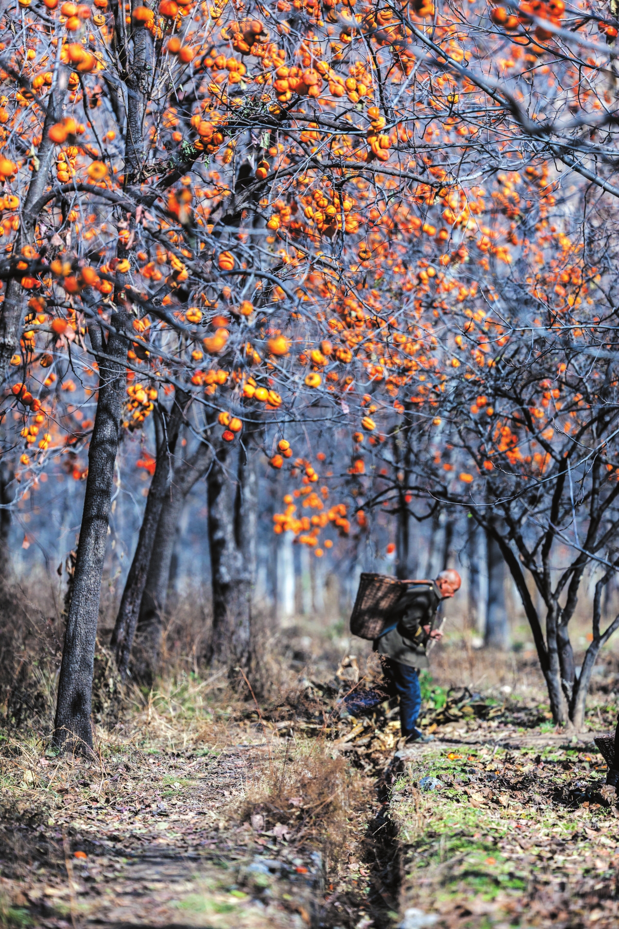 地頭那畔,景象便不同了。一對年輕的夫婦,正手腳利落地采摘、分揀柿子。竹籃里,橙紅的果實漸漸堆成小山。他們時而低語,聲音輕得像風拂過枝梢,說的或許是今年柿子的成色,盤算著能賣個好價錢;或許是在憧憬,等這筆錢到手,該給娃添置些什么。他們額上有細密的汗珠,眉宇間有勞作后的倦色,但那份倦色底下,卻藏不住一股子蓬勃向上的勁兒,一種屬于明天的、清亮亮的盼頭。