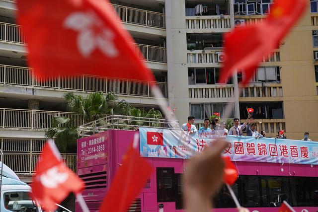 7月1日,市民揮舞國旗、區旗和巡游巴士互動。新華社記者王申 攝