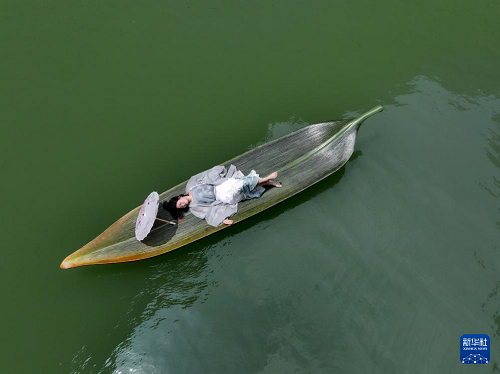 7月9日,游客在鶴峰縣屏山峽谷體驗游船項目(無人機照片)。(新華社發 趙軍 攝)