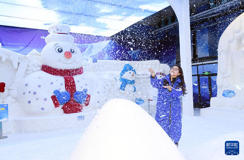 7月9日,在哈爾濱太陽島冰雪藝術館互動戲雪區,游客體驗夏日戲雪。(新華社發 劉洋 攝)