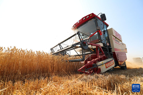 6月10日,河北省石家莊市欒城區(qū)柳林屯鄉(xiāng)東牛村村民駕駛農(nóng)機(jī)收割小麥。(新華社發(fā) 梁子棟 攝)