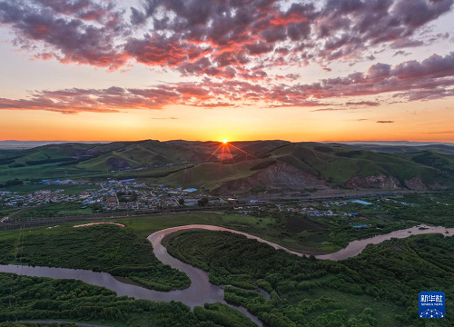 這是7月11日在內蒙古免渡河國家濕地公園拍攝的日出景色(無人機照片)。(新華社記者 馬金瑞 攝)