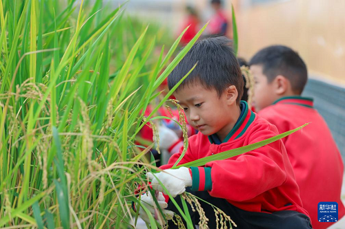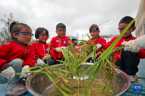 10月15日,云南省曲靖市陸良縣大莫古鎮中心幼兒園的孩子們在校內勞動基地體驗打稻穗。(新華社發 王勇 攝)