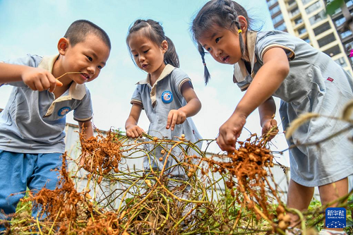 10月15日,在湖南省永州市道縣城東幼兒園,小朋友在體驗采收花生。(新華社發 蔣克青 攝)