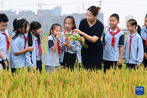 10月15日,江蘇省太倉市港城小學老師為孩子們講解水稻生長知識。(新華社發 計海新 攝)