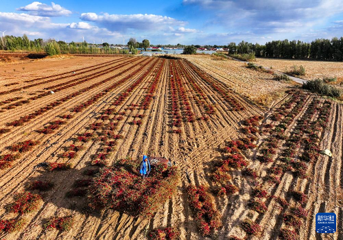 10月19日,在通遼市開魯縣東風鎮六合堂村,村民在田地里收獲干椒(無人機照片)。(新華社記者 連振 攝)
