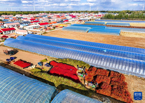 10月19日,在通遼市開魯縣東風鎮六合堂村,村民在田地里晾曬紅干椒。(新華社記者 連振 攝)