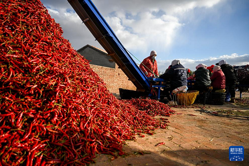 10月19日,在通遼市開魯縣東風鎮六合堂村,村民在分揀紅干椒。(新華社記者 連振 攝)