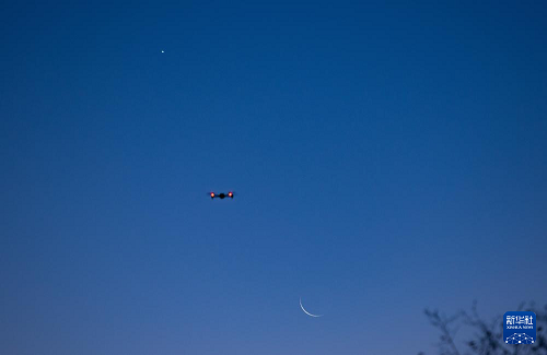 10月20日,在位于黑龍江省黑河市的北大荒集團北安分公司趙光農場有限公司,攝影愛好者在用無人機拍攝啟明星伴月。(新華社發 錢泊羽 攝)