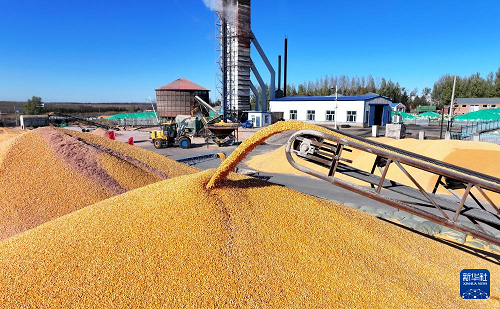 10月23日在北大荒集團黑龍江尾山農場有限公司一烘干企業拍攝的玉米烘干作業現場(無人機照片)。(新華社發 陸文祥 攝)