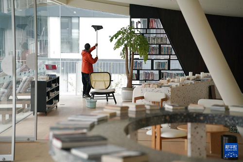 10月29日,在鎮坪縣牛頭店鎮國慶村,一家山居酒店工作人員在酒店書吧內打掃衛生。(新華社記者 邵瑞 攝)