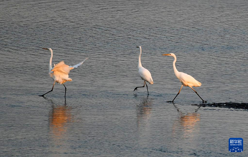 11月3日,在黑龍江省牡丹江市江心島附近的江灘淺流中,白鷺在覓食。(新華社發 張春祥 攝)