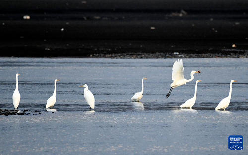 11月4日,在黑龍江省牡丹江市江心島附近的江灘淺流中,白鷺在覓食。(新華社發 張春祥 攝)