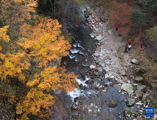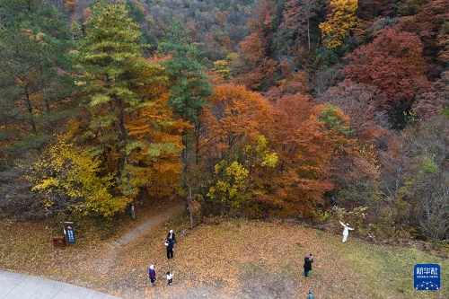 11月5日,游人在位于漢中市南鄭區的黎坪國家森林公園內拍照游玩(無人機照片)。(新華社記者 邵瑞 攝)