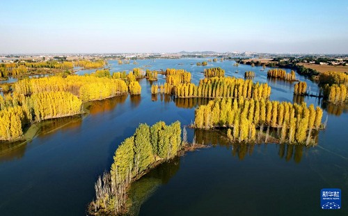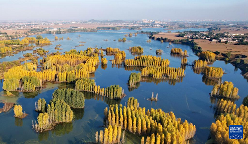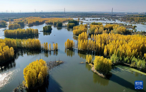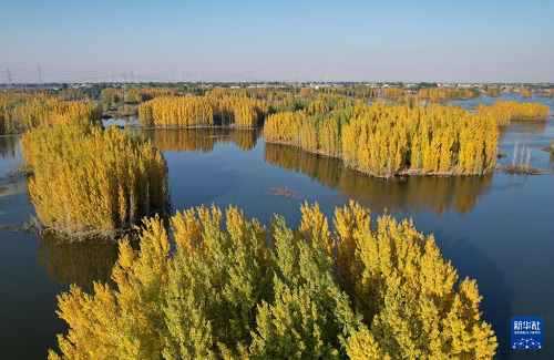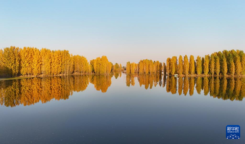 初冬時節,在河北省邢臺市隆堯縣亦城村泜河沿岸,樹葉金黃,與水面、河岸相映襯,勾勒出一幅美麗和諧的自然畫卷。