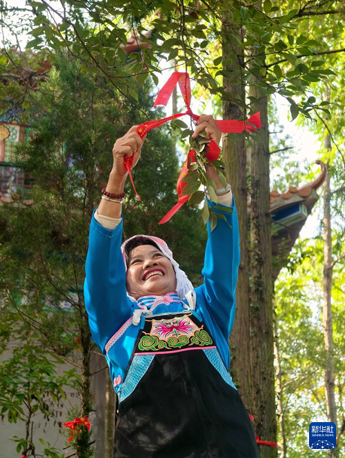 10月29日重陽節,廣西南丹縣群眾按照傳統習俗在樹木上懸掛福壽帶。(新華社發 高東風 攝)