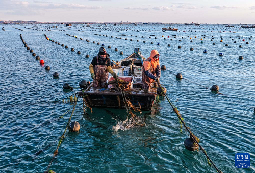 11月19日,在山東省榮成市愛倫灣海帶養殖區,工人進行海帶播苗作業(無人機照片)。(新華社發 楊志禮 攝)