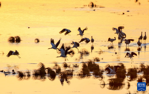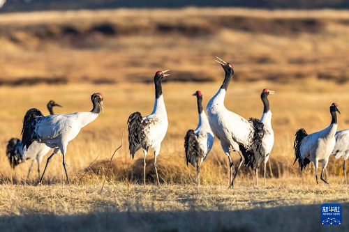 11月29日,黑頸鶴在大山包黑頸鶴國(guó)家級(jí)自然保護(hù)區(qū)內(nèi)的大海子濕地飛舞。(新華社發(fā) 陳熙 攝)