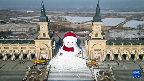 12月14日拍攝的建設中的哈爾濱市群力音樂公園網紅大雪人(無人機照片)。(新華社發 劉洋 攝)
