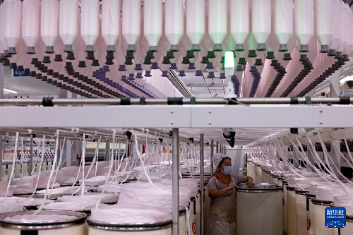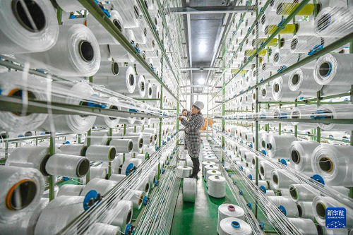 12月16日, 工人在山東棗莊經濟開發區一家企業的智能化生產線上加工高端紗線。(新華社發 孫中喆 攝)