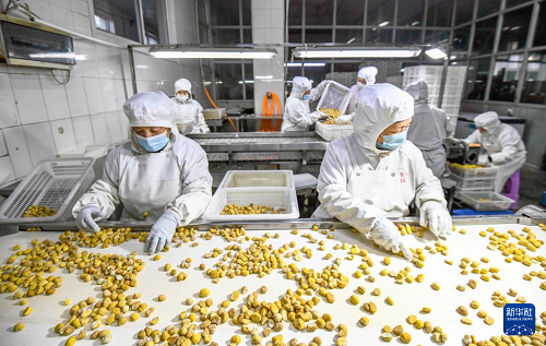 12月16日,工人在河北省遵化市蘇家洼鎮的一家食品有限公司車間加工板栗。(新華社發 劉滿倉 攝)