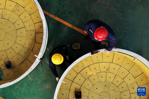 12月16日,在山東青島中青林集團有限公司生產車間,工人在安裝攪拌機襯板(無人機照片)。(新華社發 王海濱 攝)