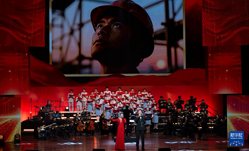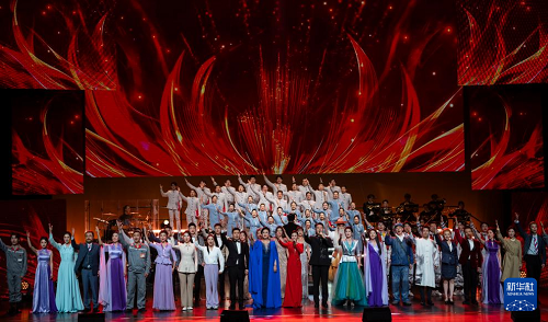 12月16日,在北京二七劇場(chǎng)舉辦的“中國(guó)夢(mèng)·勞動(dòng)美”2026新年音樂(lè)會(huì)上,演員在大合唱《億萬(wàn)職工心向黨》中歌唱。(新華社記者 才揚(yáng) 攝)