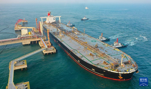 12月18日,一艘裝載著石化原輔料的外籍船舶泊入國投洋浦油儲碼頭30萬噸級原油泊位(無人機照片)。(新華社記者 郭程 攝)