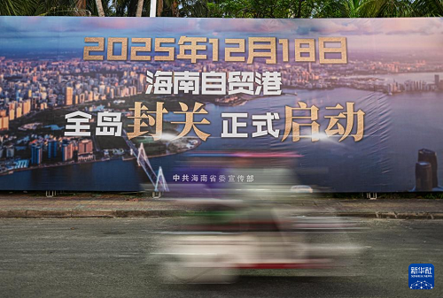這是12月17日在海南文昌街頭拍攝的關于海南自由貿易港全島封關正式啟動的宣傳牌。(新華社記者 蒲曉旭 攝)
