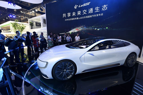 4月25日,觀眾在參觀車(chē)展展出的樂(lè)視電動(dòng)汽車(chē)。當(dāng)日,2016(第十四屆)北京國(guó)際汽車(chē)展覽會(huì)在京開(kāi)幕。新華社記者鞠煥宗攝