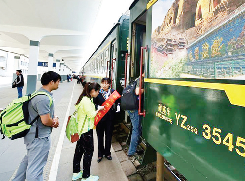 5月27日,旅客在大同火車站檢票登上Y665次列車。當日,山西省首趟“Y”(游)字頭城際旅游專列Y665次列車從大同火車站駛出,開往太原,兩座城市間的旅行時間縮短至3小時以內。這輛被命名為“云岡號”的一站直達列車由6節硬座車、1節硬臥車、1節軟臥車組成,每逢周五、六、日發車,運行時長較目前兩地開行的最快列車還要節省近50分鐘。(來源:黃河新聞網)