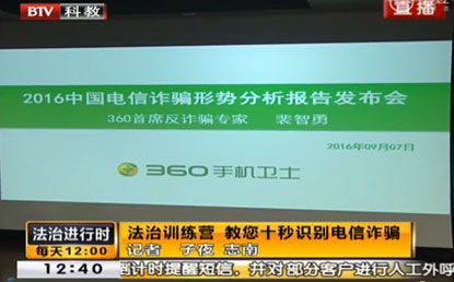 中國經濟網北京9月12訊 生活中,當你接到詐騙電話的時候,你要多久能發現這個騙局呢,10秒?20秒?還是根本識別不出來?9月10日,北京衛視《法治進行時》欄目在節目一開始便拋出了這樣一個問題。面對電信詐騙分子日益多變的手法,如何頭腦清晰地最快識別出騙局?這一期的《法治進行時》和360手機衛士專家一起給大家提供了很多實用的建議。