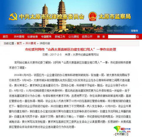 太原市紀(jì)委網(wǎng)站截圖 中國青年網(wǎng)北京2月6日電(記者 吳陽 王子瑞) 去年12月29日中國青年網(wǎng)報(bào)道了《被違規(guī)開發(fā)商糾纏 太原高新區(qū)一官員1分鐘連爆9句粗口》事件。昨天,太原市紀(jì)委官方網(wǎng)站公布了對此事的處理結(jié)果。市紀(jì)委報(bào)經(jīng)市委同意后,決定對白建生誡勉談話,責(zé)令其寫出深刻檢查,要求其在高新區(qū)黨工委民主生活會上認(rèn)真查擺問題,反思剖析;并責(zé)成高新區(qū)管委會依法依規(guī)盡快對該企業(yè)違法建設(shè)行為作出處理。 去年12月底,一段名為《山西太原:高新區(qū)官員對投資方一分鐘談話九個(gè)“他媽X”》的視頻在山西當(dāng)?shù)亓鱾鳌T谶@段視頻中,太原高新區(qū)管委會副主任白建生對一男子說“他媽X,他找死是不是,他以為他那個(gè)地方出來的土豹子,太原市就放不下他了”。男子說,“改天坐一坐”。白建生說,“我和他坐?我還嫌他媽丟人,見了他?別和他坐了”。男子說,“企業(yè)不是著急了?”。白建生反問,“著急啥?那你想干啥就干啥來。那是自己傻X,做的事情你媽X。問我就是,我就在這坐著,第二天來了是,‘你到底給辦不辦?’”,“他以為高新區(qū)多年他媽X軟X?”。
