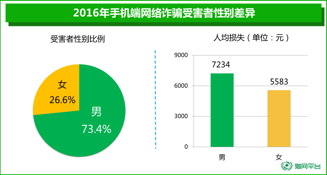 通常情況下,男性會認為自己思維更加理性,不易上當受騙,然而實際情況恰恰相反。從手機端舉報用戶的性別差異來看,在遭受網絡詐騙的人群中,男性受害者占比超過七成,為73.4%,相比之下,女性受害者被騙數量占比僅為26.6%。此外,男性不僅占比大,而且人均損失為7234元,也超過了女性的5583元。