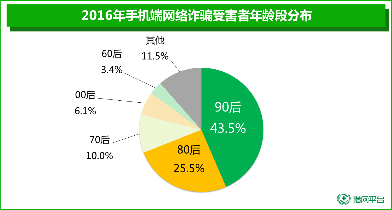 從被騙網民的年齡結構上看,90后受網絡詐騙的比例最高,占受害者總數的43.5%,其次是80后占比25.5%,70后占比10.0%。